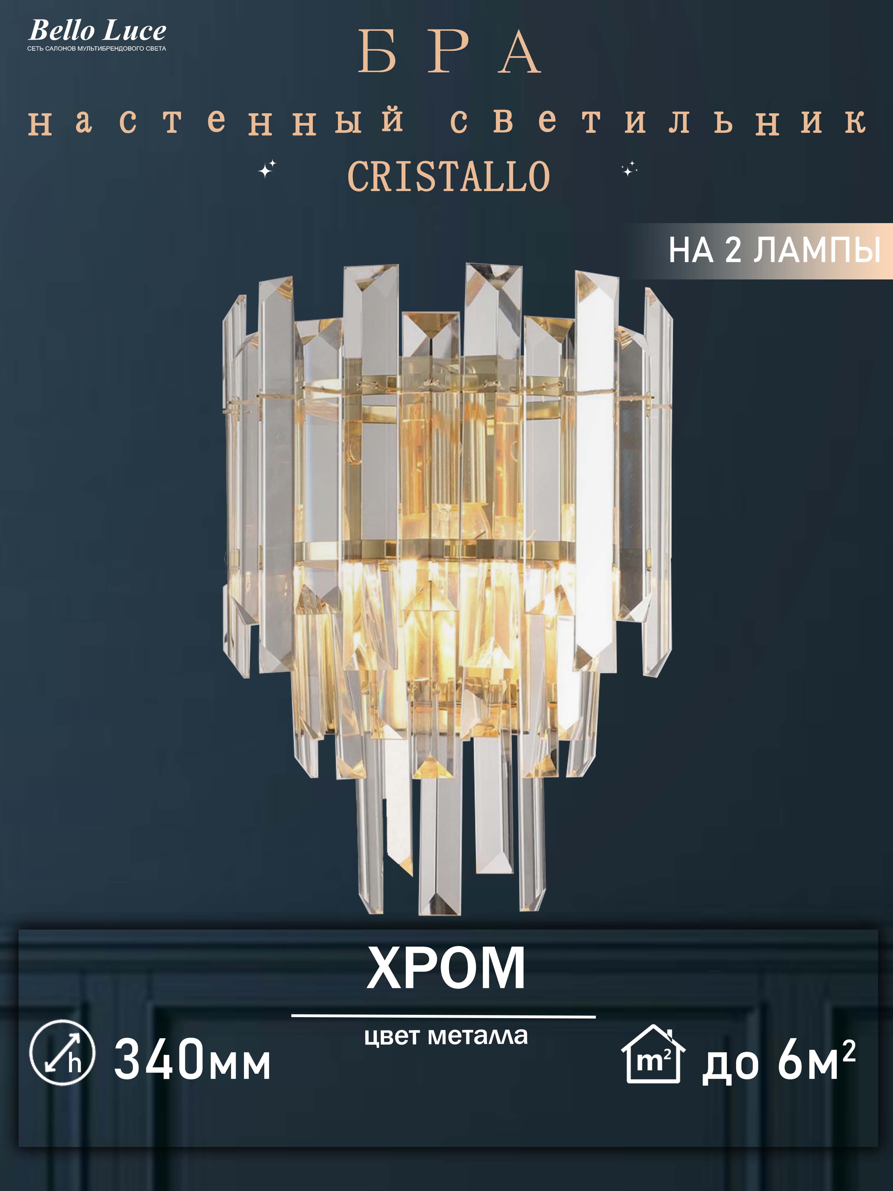 Компания Мегасвет предлагает вам оптом и в розницу Светильник настенный Cristallo хром с прозрачными хрустальными подвесками, бра на 2 лампы E14 по цене 6200 рублей.