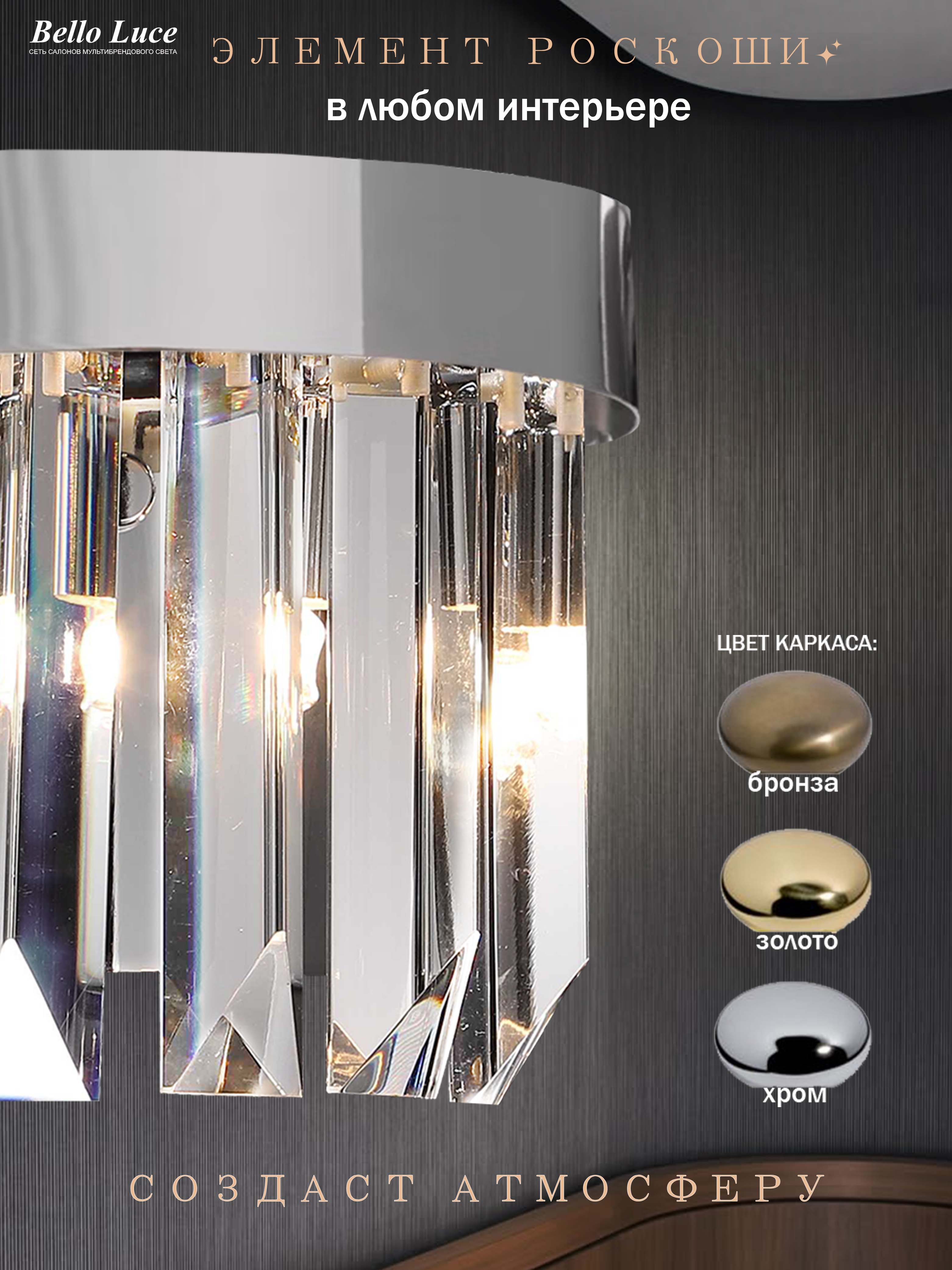 Светильник обеспечивает равномерное и мягкое освещение, что позволяет использовать его как для общего освещения, так и для создания акцентного света. Хрустальные элементы красиво рассеивают свет, создавая завораживающую игру света и теней. Обратите внимание на качество материалов и выполнения прибора — они делают его надежным и долговечным.