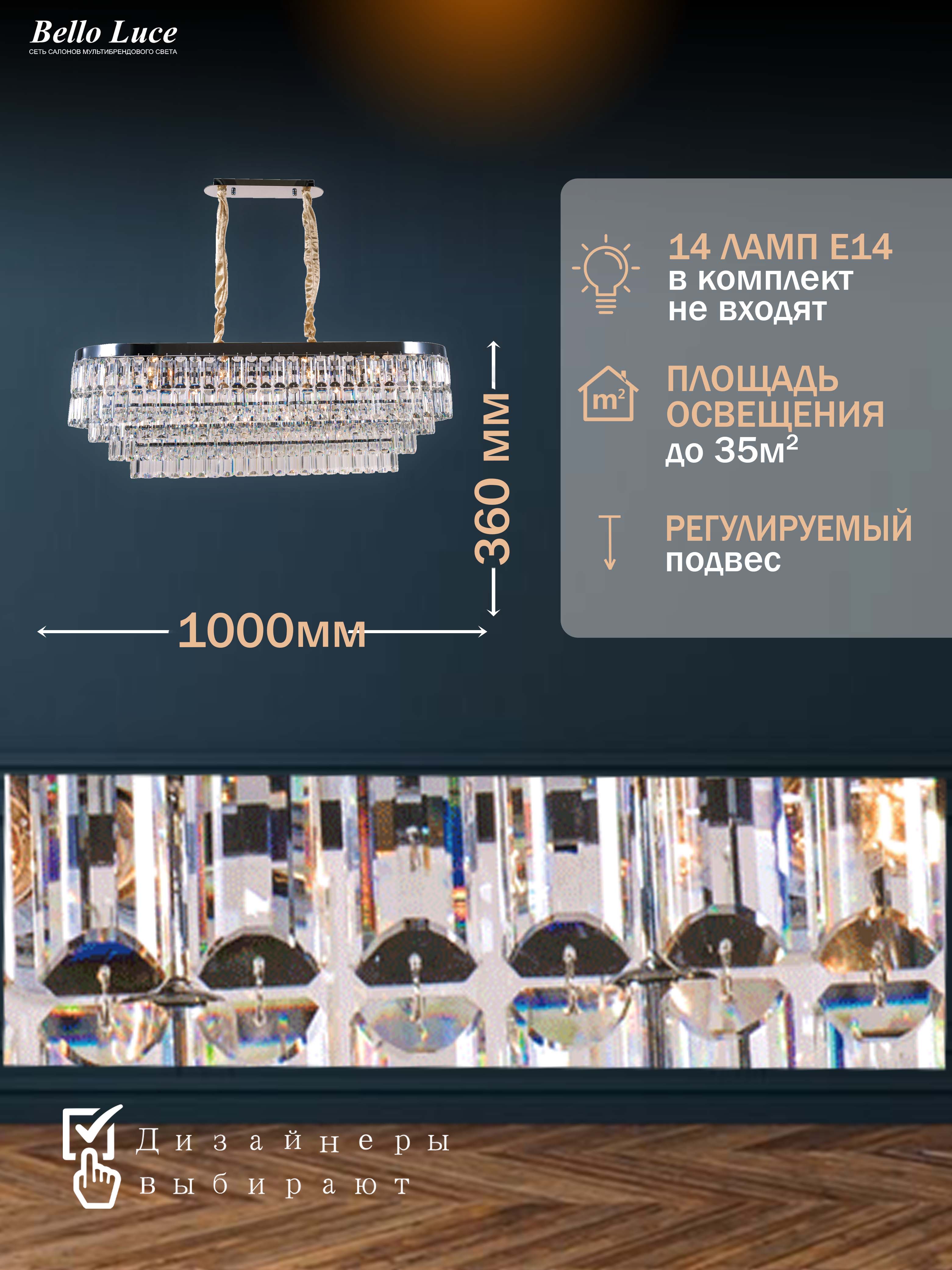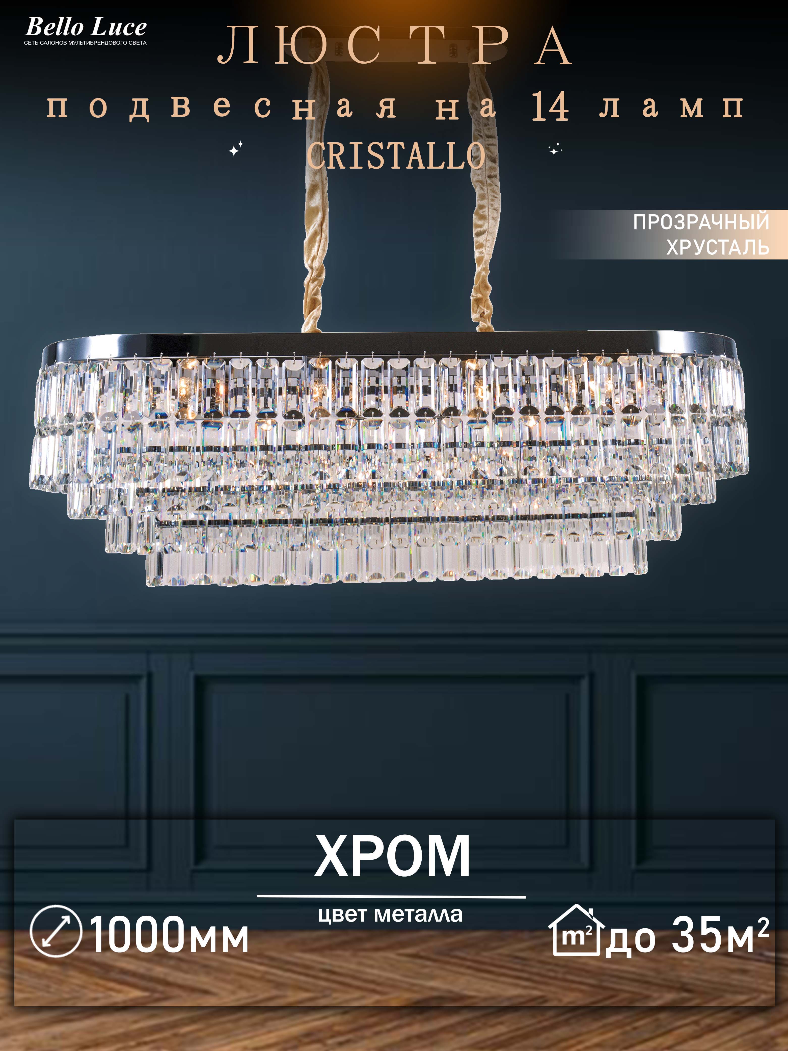 Компания Мегасвет предлагает вам оптом и в розницу Люстра Cristallo хрустальная хром подвесная с прозрачными хрустальными подвесками на 14 ламп E14, регулировка по высоте по цене 44460 рублей.