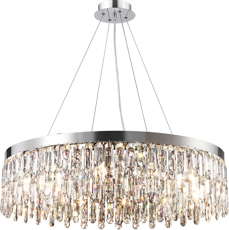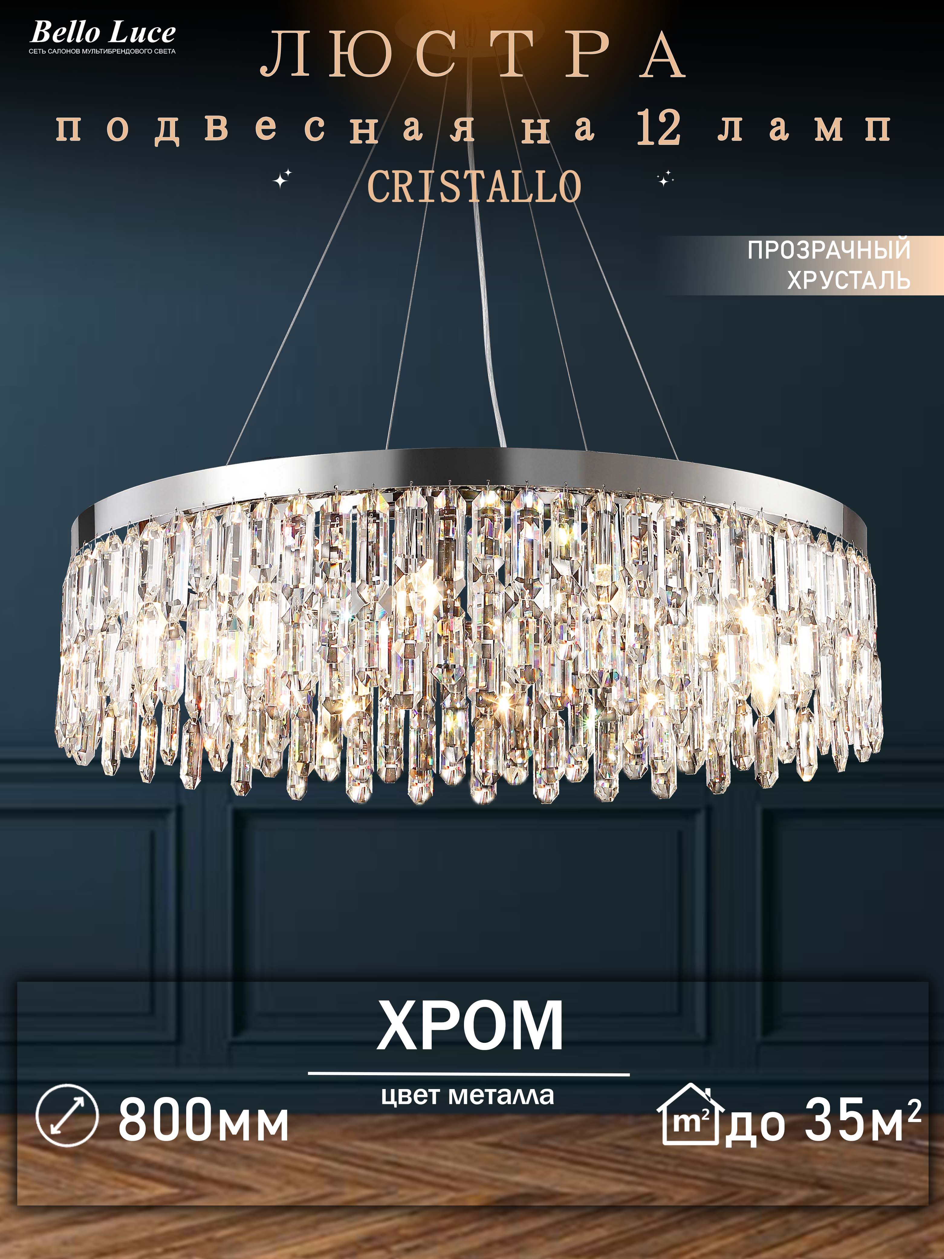 Компания Мегасвет предлагает вам оптом и в розницу Люстра Cristallo хрустальная хром подвесная с прозрачными хрустальными подвесками на 12 ламп E14, регулировка по высоте по цене 51237 рублей.