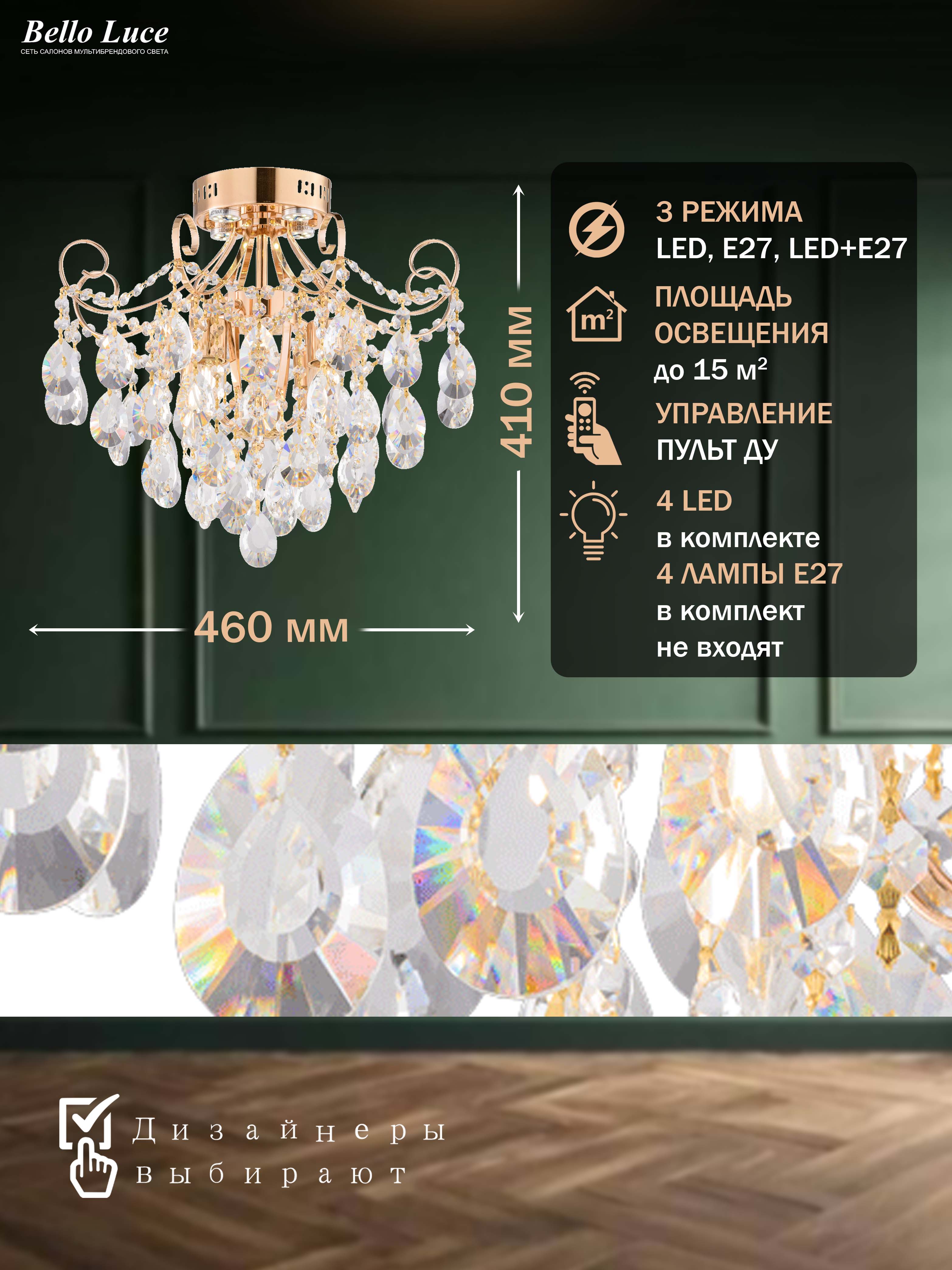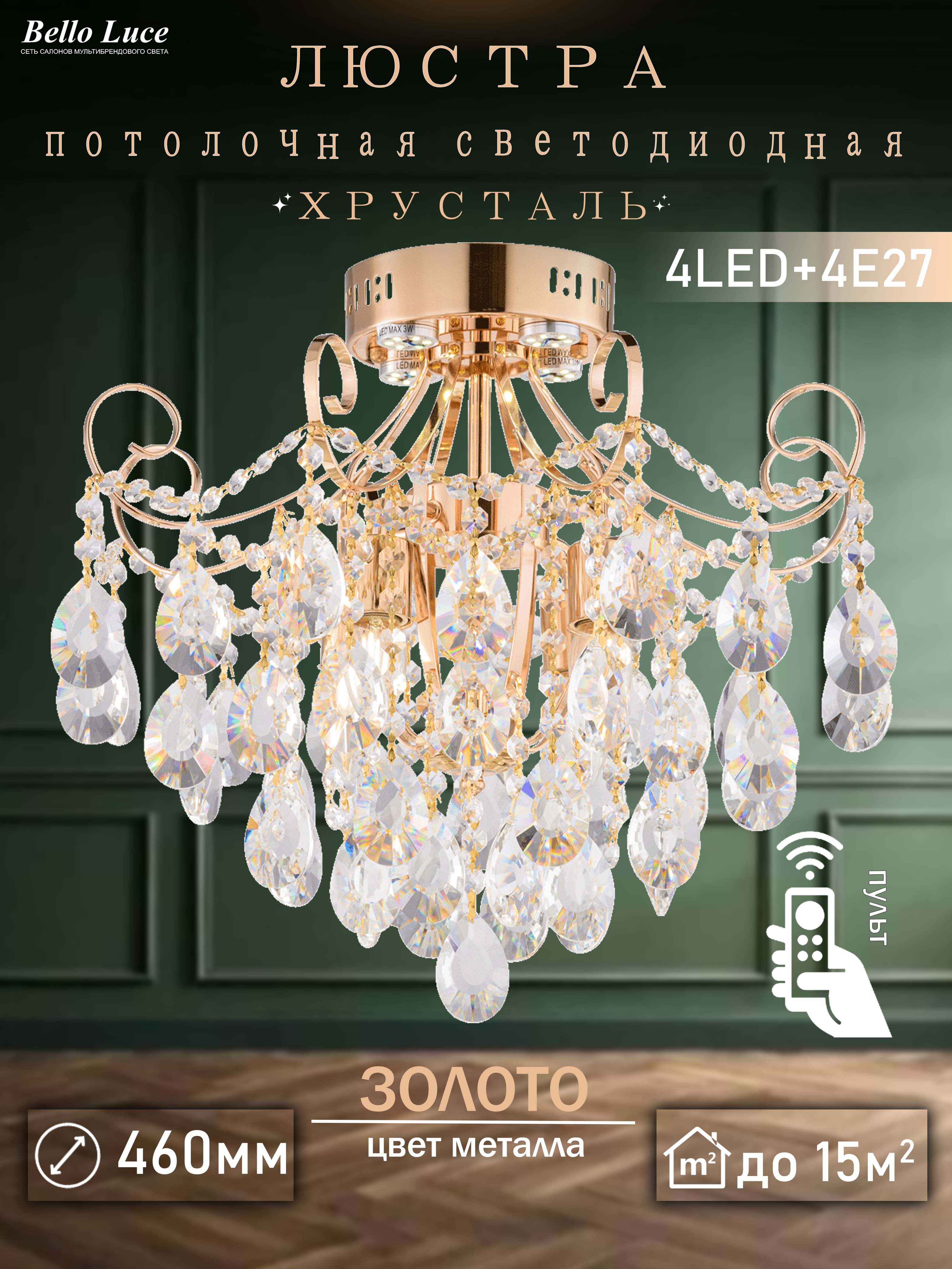Компания Мегасвет предлагает вам оптом и в розницу Люстра хрустальная потолочная с подсветкой с пультом круглая золото с прозрачными хрустальными подвесками на 4Led модулей + 4 E27 по цене 10170 рублей.