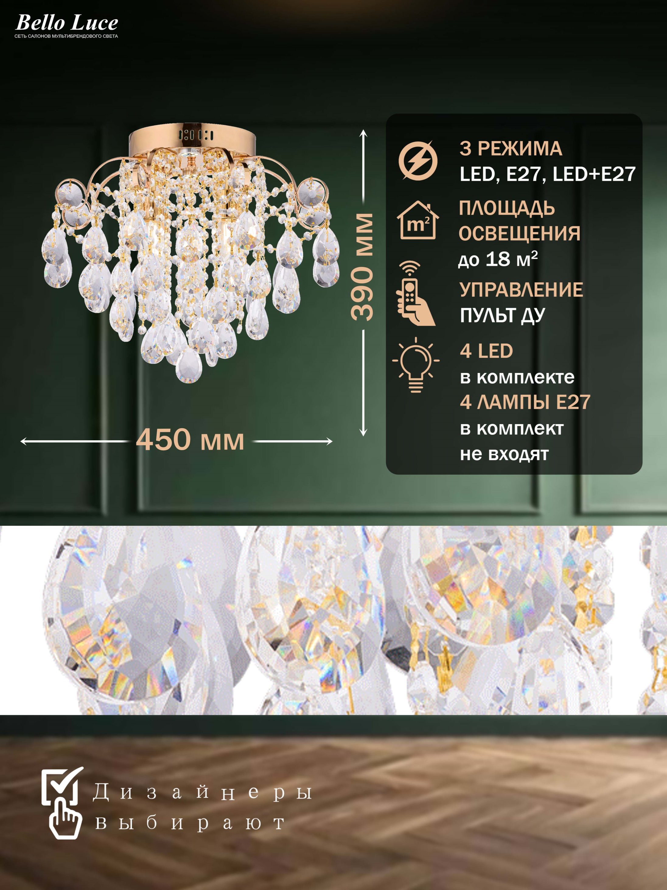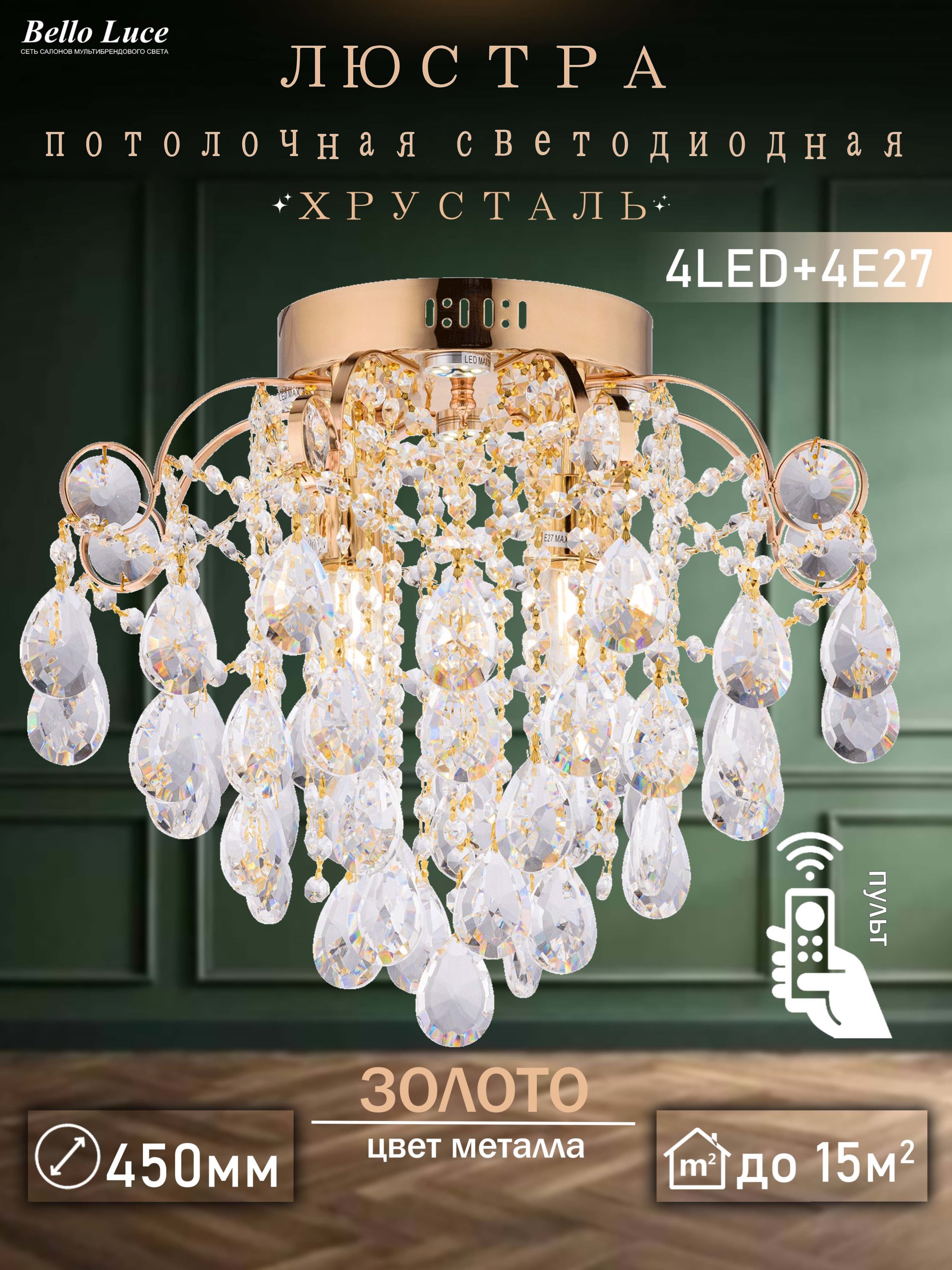 Компания Мегасвет предлагает вам оптом и в розницу Люстра хрустальная потолочная с подсветкой с пультом круглая золото с прозрачными хрустальными подвесками на 4Led модулей + 4 E27 по цене 10170 рублей.