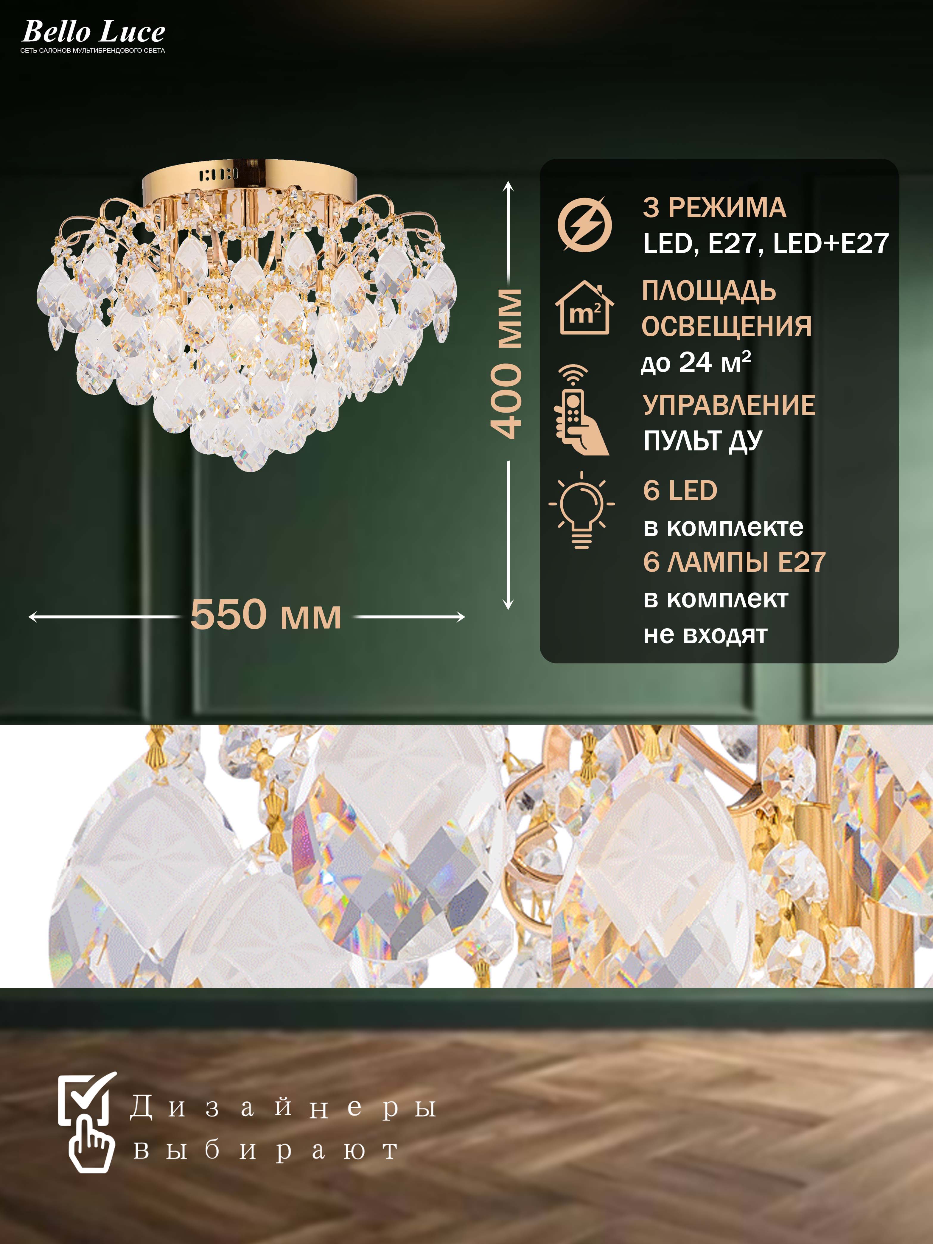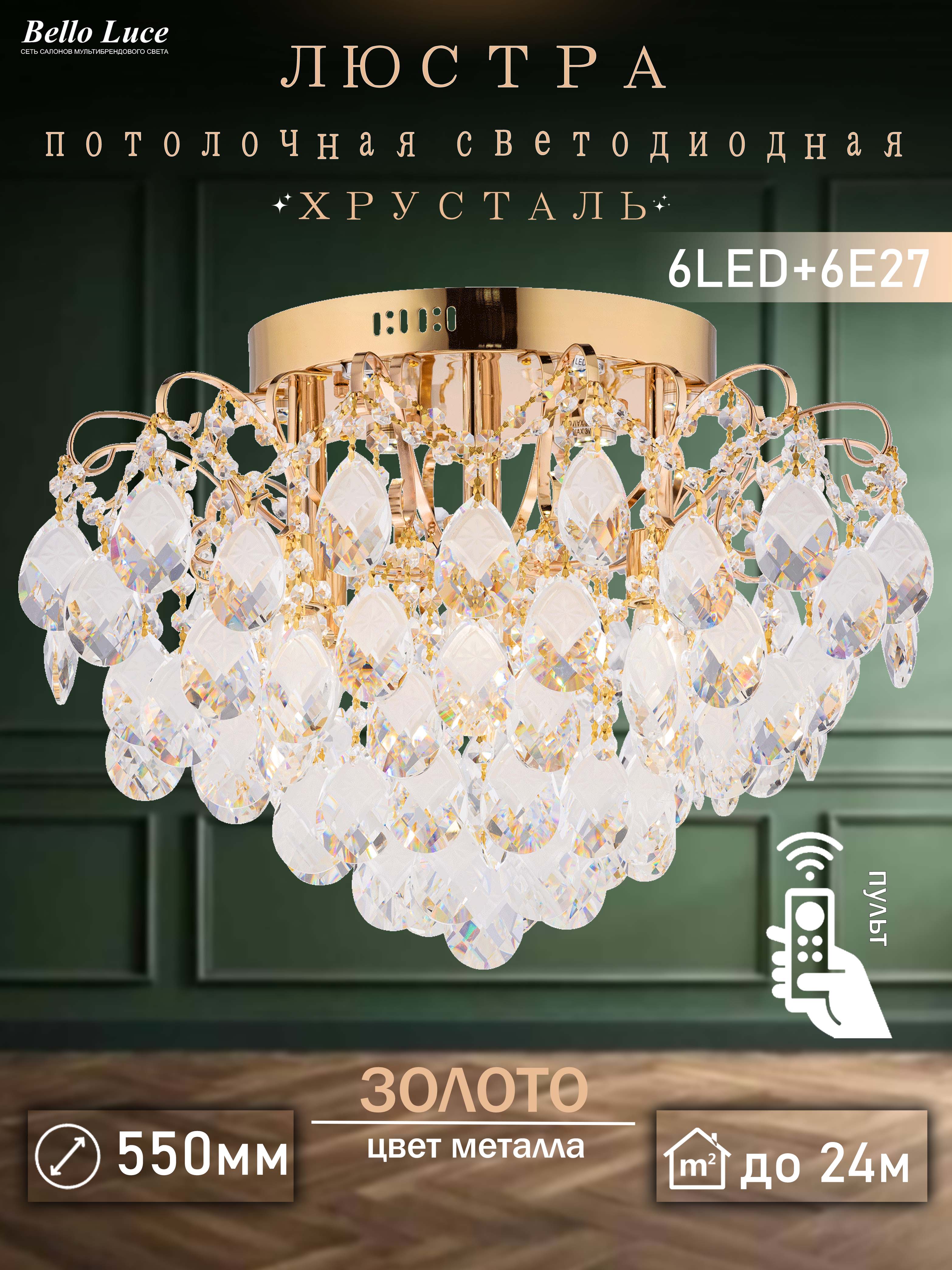 Компания Мегасвет предлагает вам оптом и в розницу Люстра хрустальная потолочная с подсветкой с пультом круглая, золото, 6Led лампы+6 E27 по цене 20430 рублей.