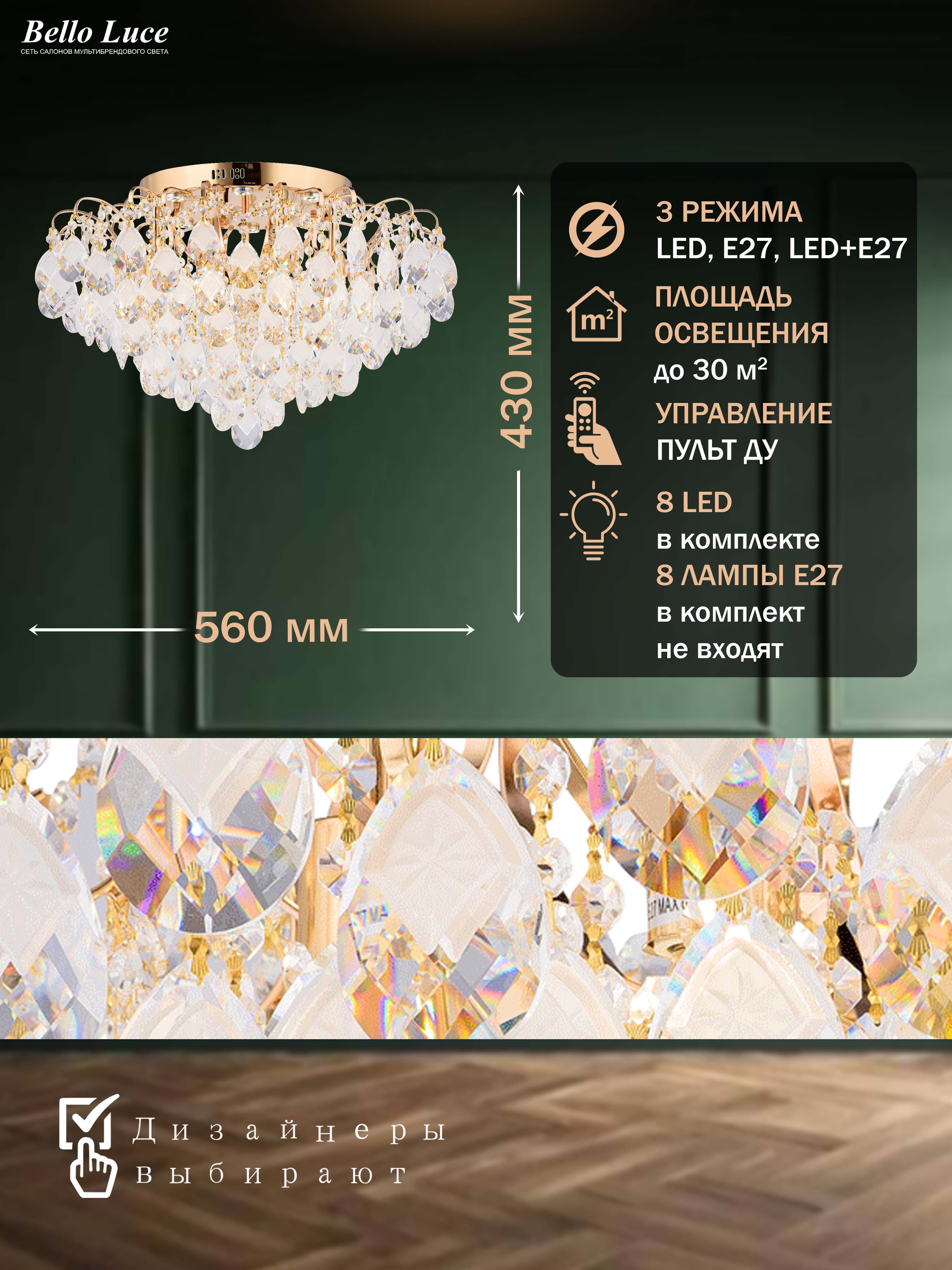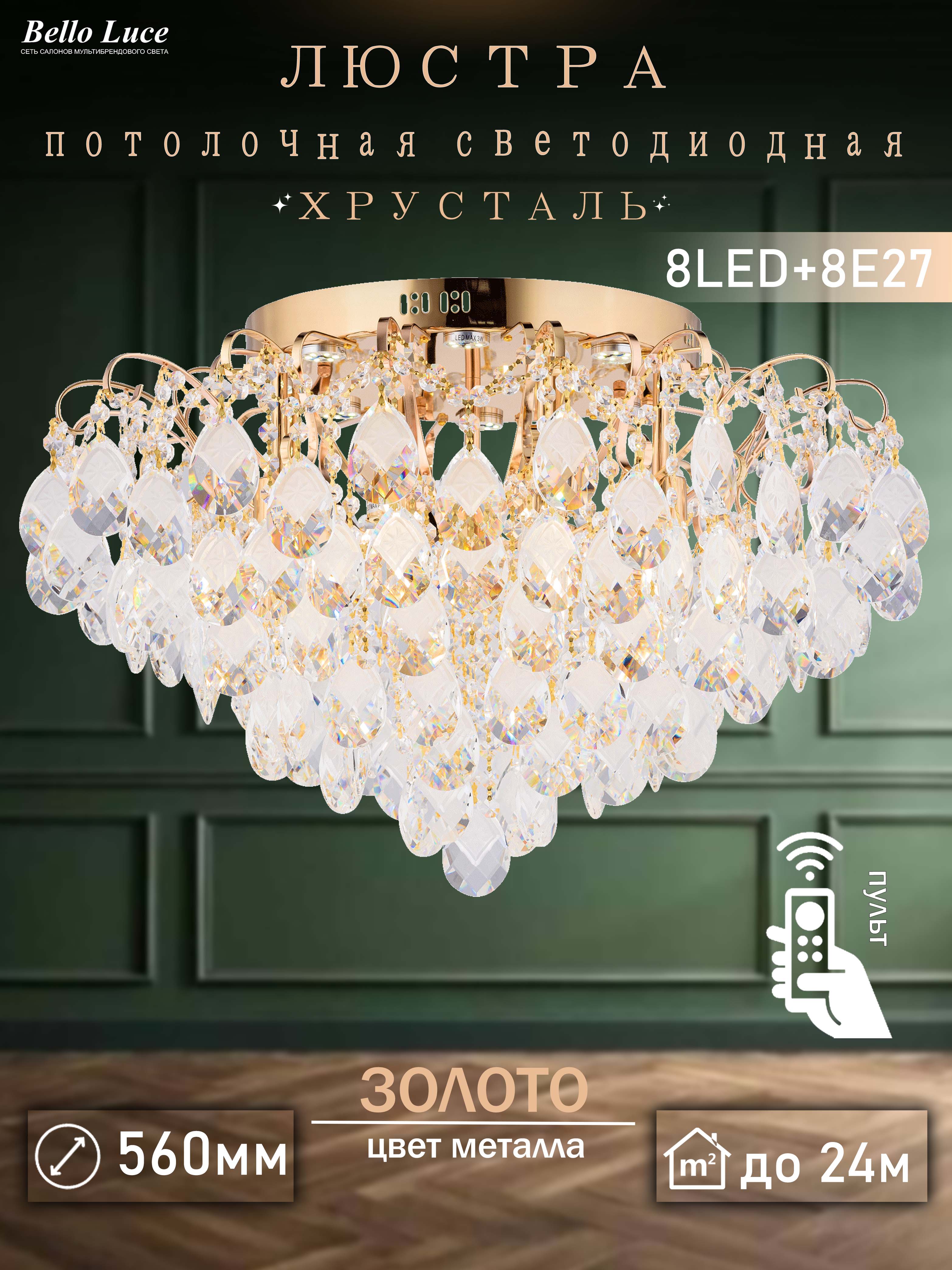 Компания Мегасвет предлагает вам оптом и в розницу Люстра хрустальная потолочная с подсветкой с пультом круглая, золото, 8Led лампы+8 E27 по цене 26082 рублей.