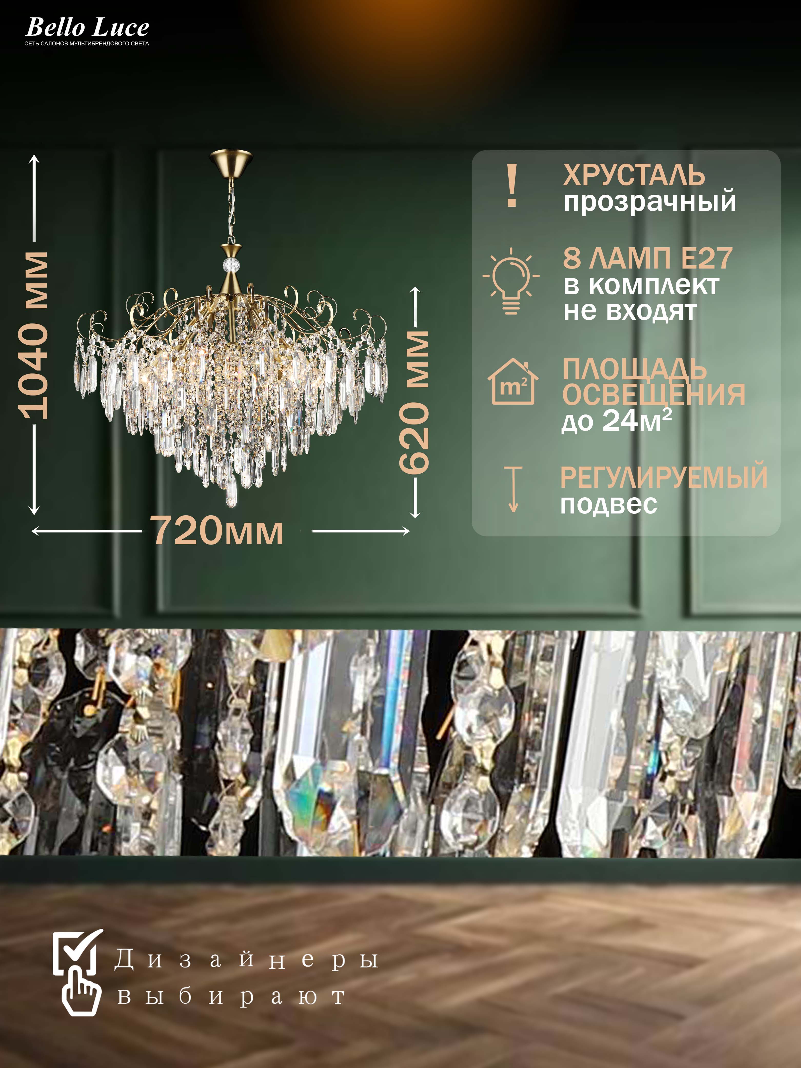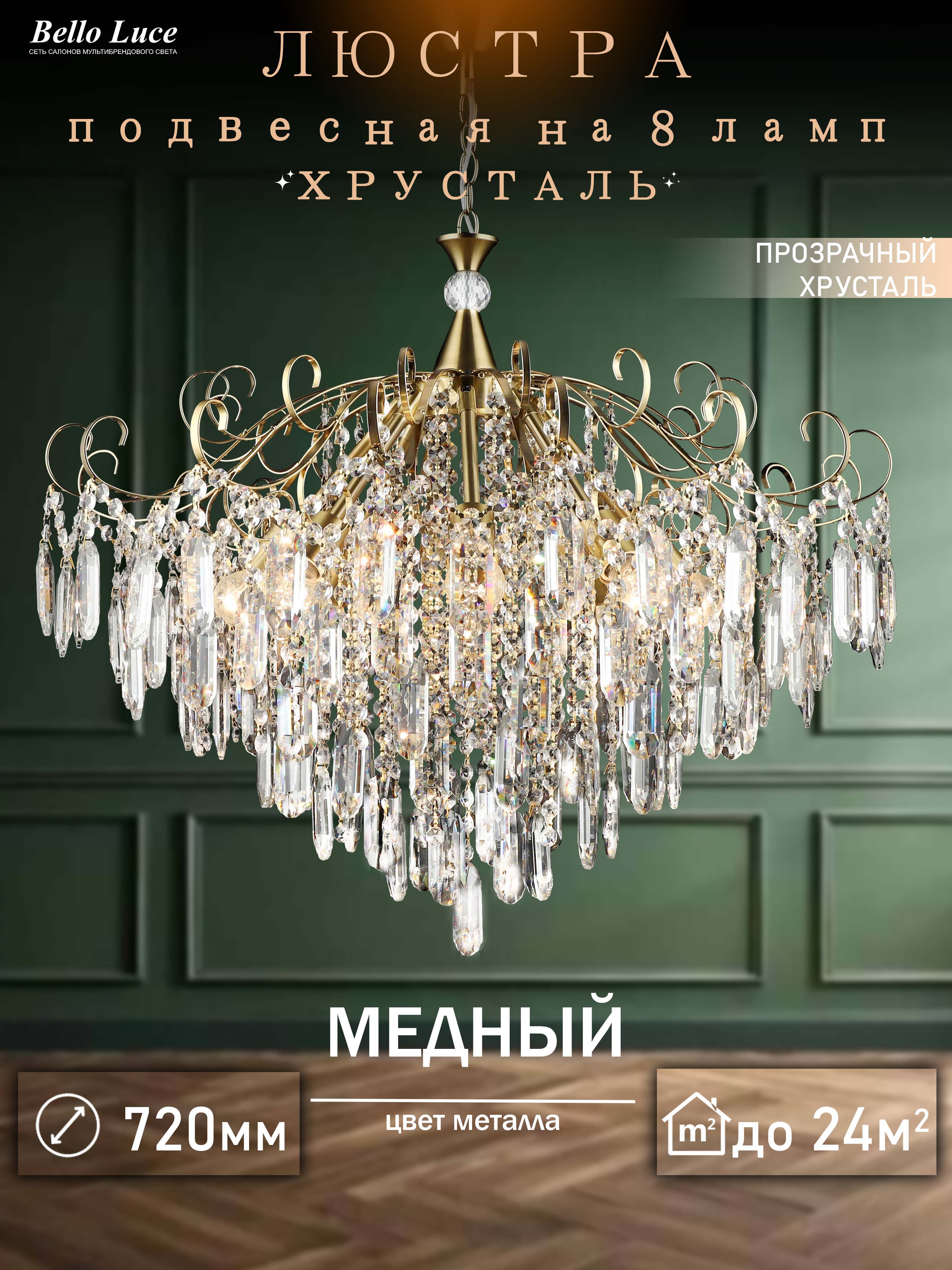 Компания Мегасвет предлагает вам оптом и в розницу Люстра хрустальная медь подвесная с прозрачными хрустальными подвесками на 8 лампы E27, регулировка по высоте по цене 22420 рублей.