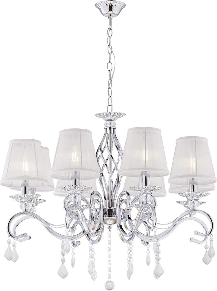 Компания Мегасвет предлагает вам оптом и в розницу Люстра Классика подвесная хром с прозрачными хрустальными подвесками на 8 ламп E14, белый текстильный абажур, регулировка по высоте по цене 10600 рублей.