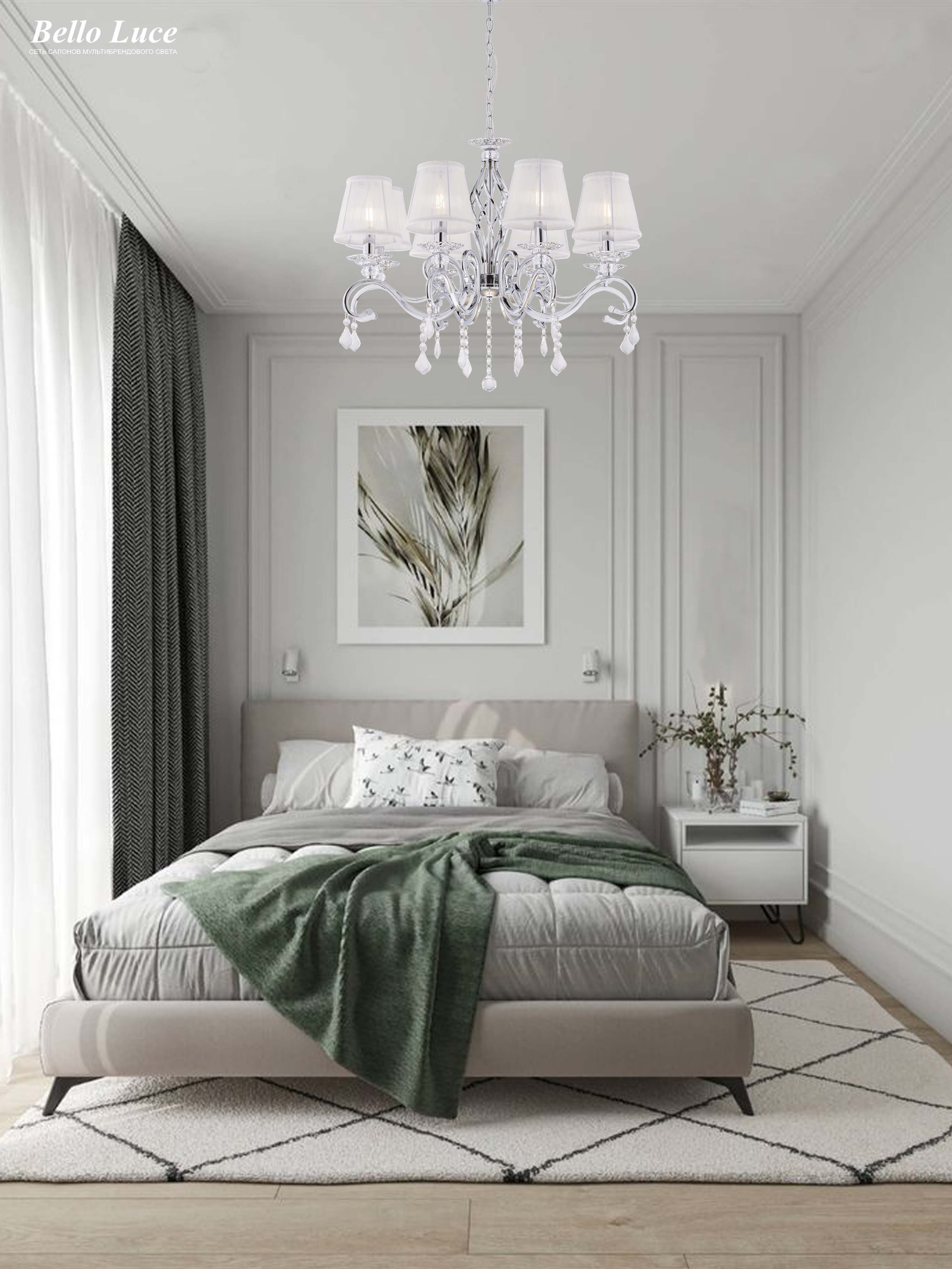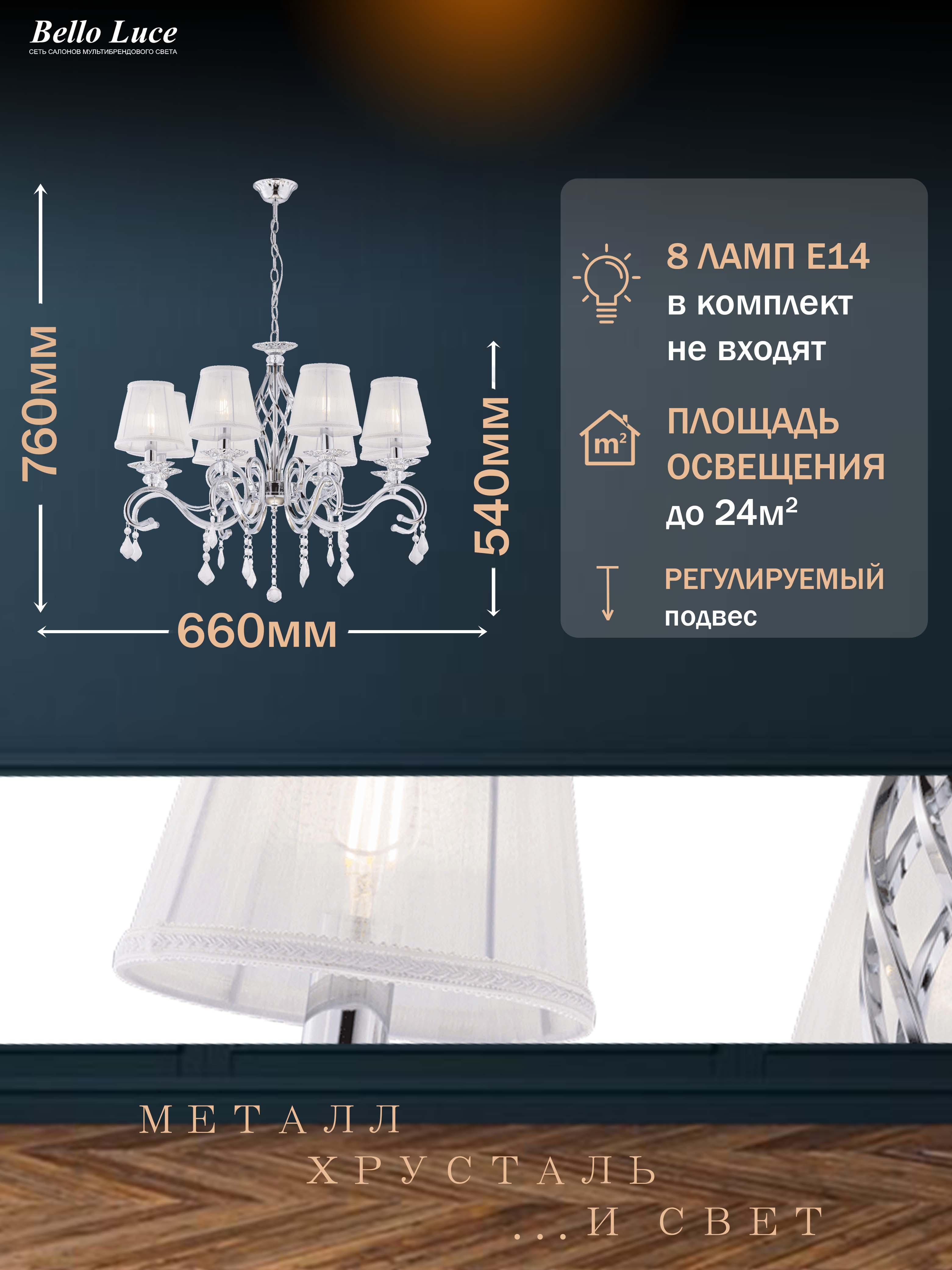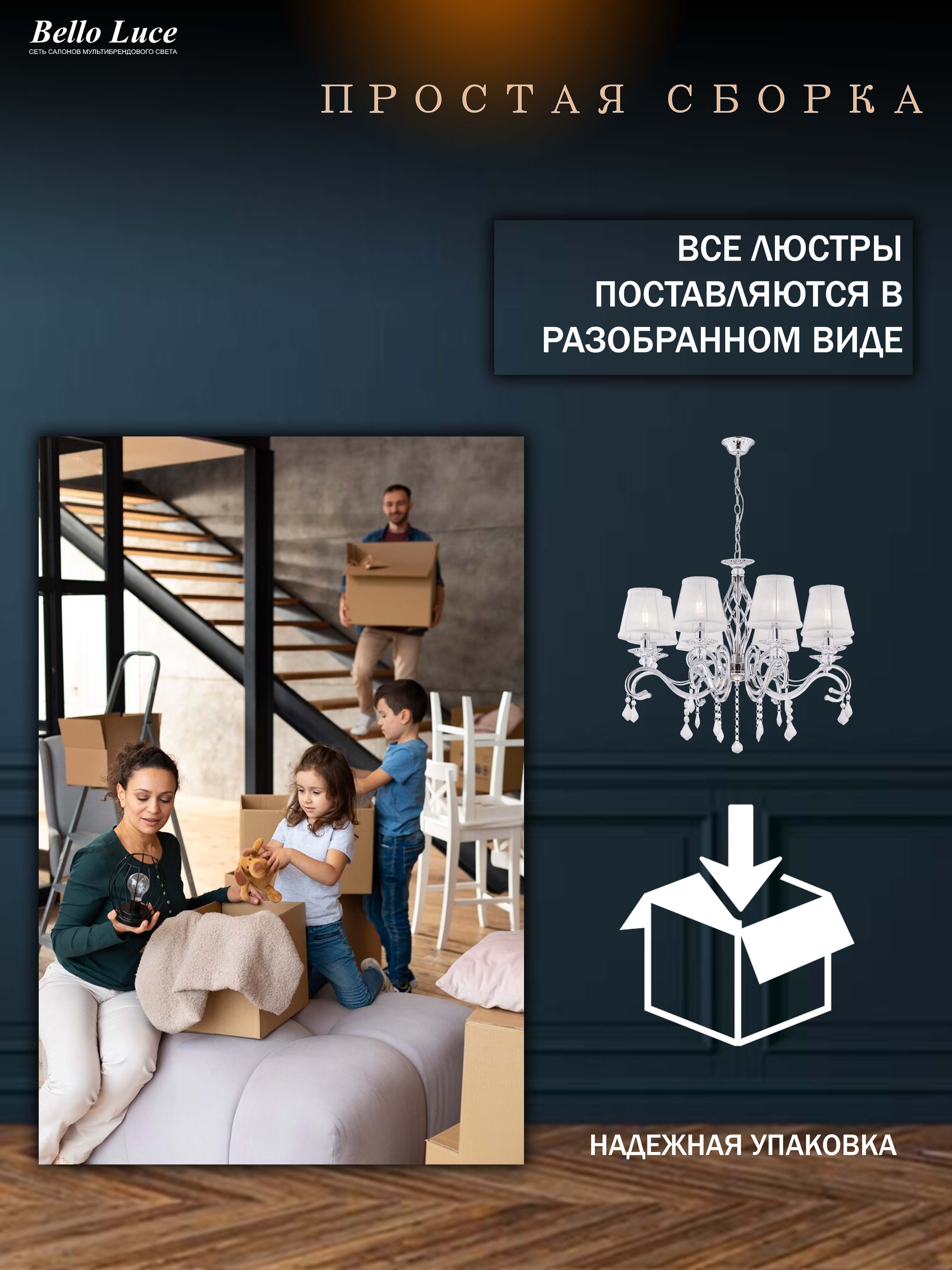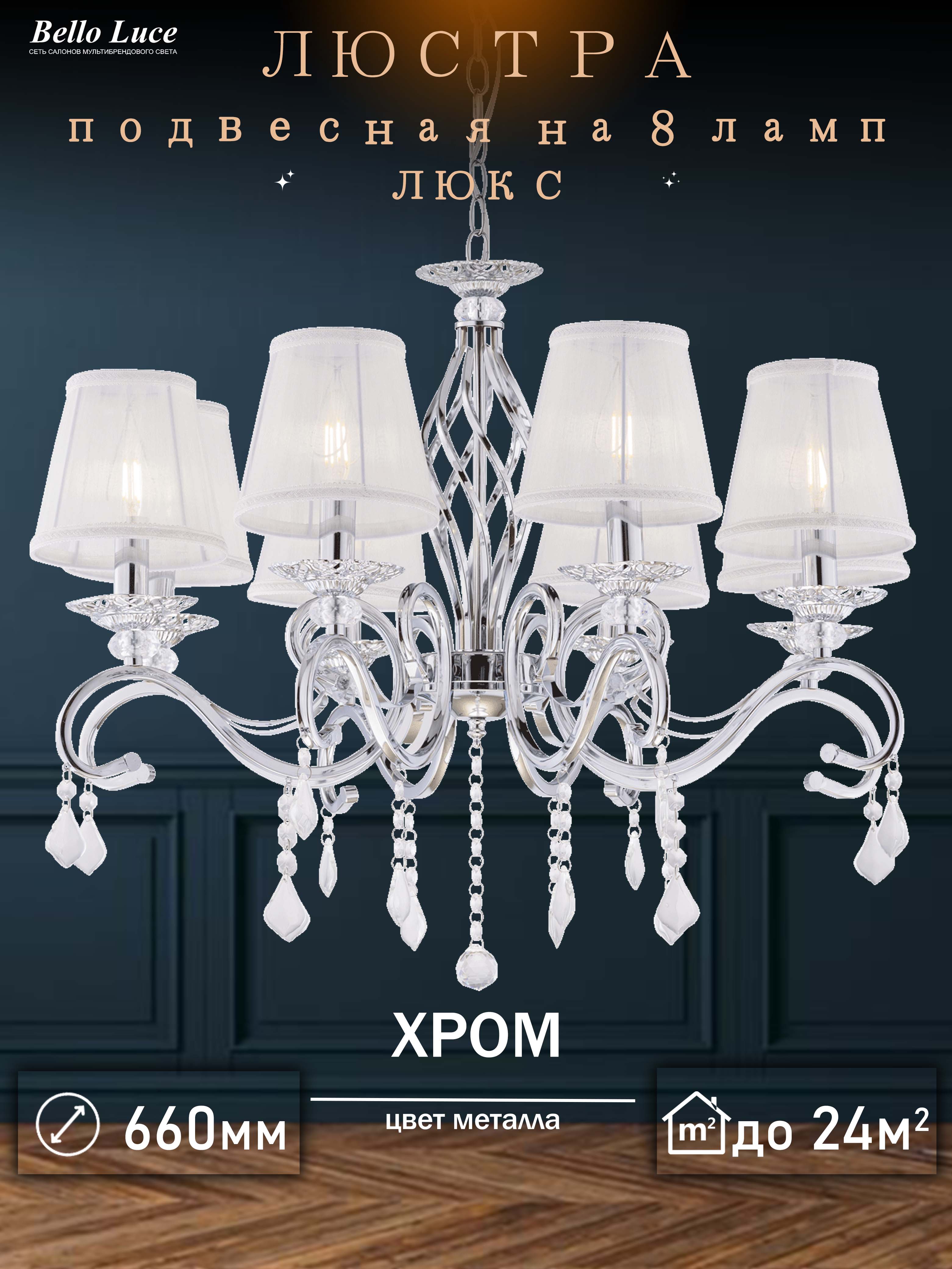 Она идеально впишется в разные интерьеры, будь то гостиная, спальня или обеденная зона. Хрустальные элементы добавляют изысканности и утонченности, а классический дизайн делает эту люстру универсальным выбором для разнообразных стилей — от традиционного до современного.